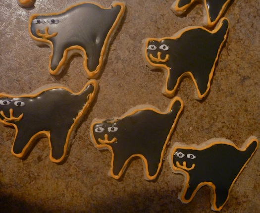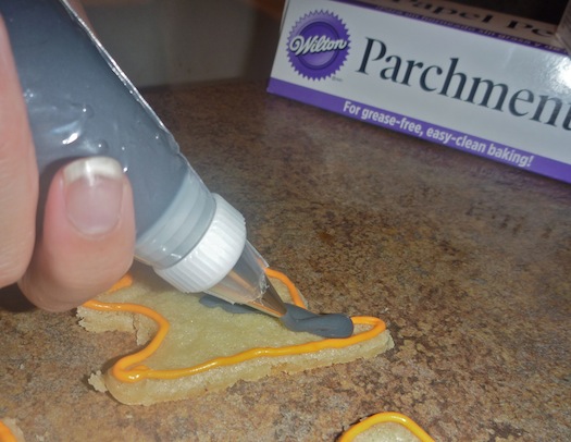 Royal icing is fun. It’s liquid like and falls into place for the most part. I’ll include the recipe for that below. Obviously I used Wilton’s Black dye for the icing. It’s as simple as confectioners sugar, meringue powder, and water.