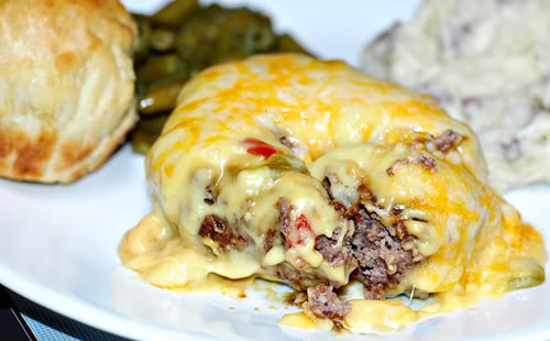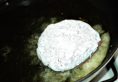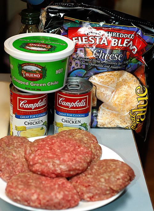 Flour up your patties and start frying them. While they are cooking, mix up your cream of soups and green chilies and set aside. When patties are done, place in casserole dish and cover with soup mixture. Top with cheese and bake in 350′ oven until warm and cheese melts.