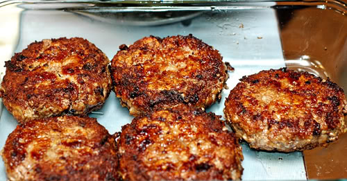 - Ground beef formed into patties