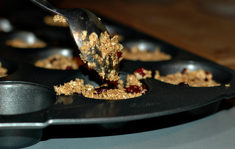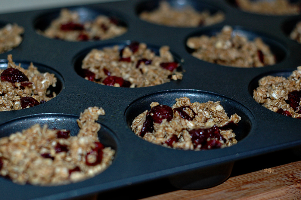 Preheat oven to 250′. Spray a 12-cup muffin pan with light cooking spray and set aside. In a medium bowl, beat together peanut butter and maple syrup on medium speed with an electric mixer, although I used a wisk. Add egg whites and pumpkin pie spice and beat again until smooth. Stir in oatmeal and cranberries. Divide mixture evenly into muffin cups. Bake for 30-35 minutes on middle rack in oven. Remove from oven and cool completely before removing clusters from pan. Store in an airtight container or they’ll get hard.
