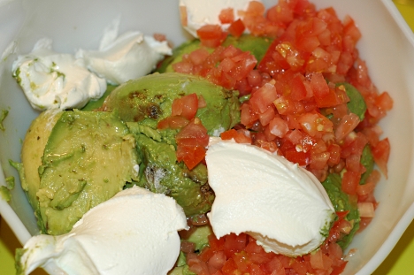 I cut my avocados in half long ways, twist off, use a knife to stab the seed and remove, and scoop out with a spoon. Dice your tomatoes and onion up and throw in a bowl with your avocados along with the sour cream, lemon juice, and salt. Now mix, mash, or whatever your little heart desires and Viola! Dang that’s easy and it’s such a good snack or party dip.