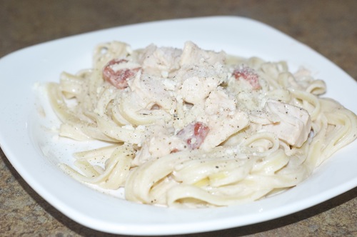 - In a medium pot combine alfredo sauce, drained tomatoes and drained chicken breast. Heat for 5-7 minutes (or until hot), stirring occasionally to prevent burning.