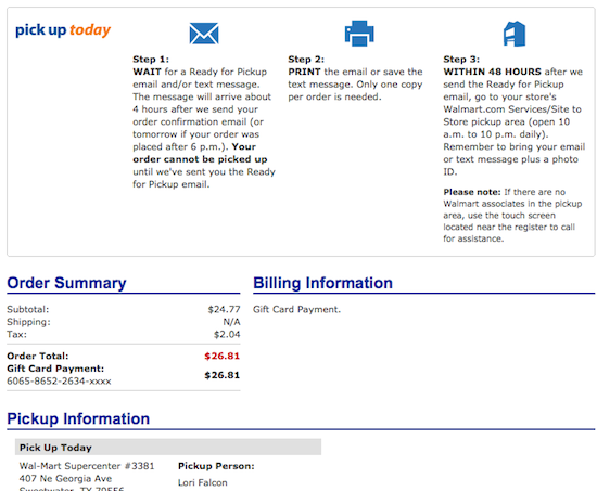 You simply put your zip code for your nearest Walmart. Then you surf to find a product to buy that has the Pick Up Today option, buy it, then wait for an email or text to say it’s ready to be picked up. I put my phone number in but never got a text but I did get an email within the hour saying it was ready. It gives you all the instructions once you check out.