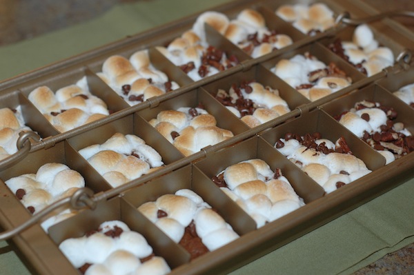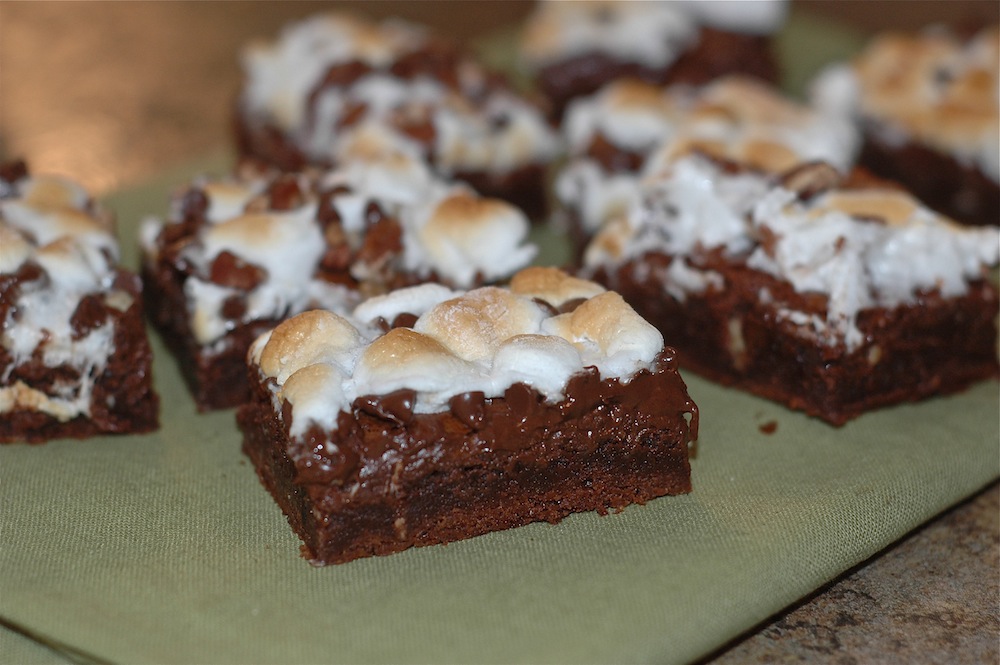 Step 4. Remove from oven, and sprinkle with remaining chocolate chips, then marshmallows and nuts. Bake until chocolate is shiny and marshmallows are puffed, about 5 minutes. Cool completely in pan. Cut into 16 squares and top with Reddi-wip!!! **DROOL*