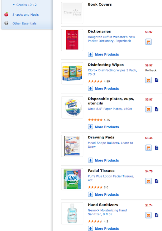 A couple of things that I love about this resource, is having a list of the most common supplies used for that grade level. Also, to the left there is a link called ‘Other Essentials’ where I was reminded of something extras that will be needed like Clorox Disinfecting Wipes. I know Truett’s Pre-K teacher used these to clean up the tables. She also used hand sanitizers, zip-loc baggies, and of course Kleenex Tissues. I think with the hoohaa of school shopping we can overlook some of these things.