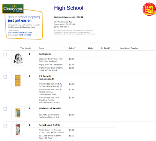 Truett’s Kindergarten class, as well as the 1st-5th graders will already have their supplies ready for them courtesy of Highland’s PTO group so my shopping was focused on Toby. Since he’s in high school, and our teachers haven’t added a list yet, we went with the most common, recommended supplies that were on the Classrooms by Walmart site. I think we did very well! Here’s some of what we got.